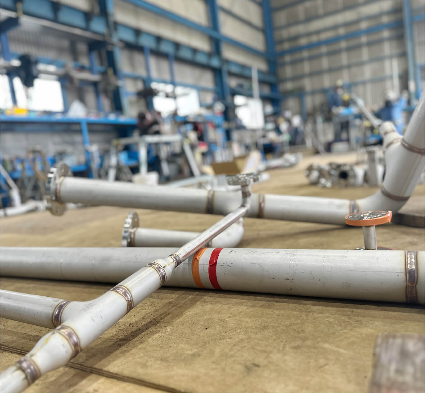 工場でパイプを製作し、現場へ搬入して取り付けるまでの一連の作業を行います。配管には溶接の技術が必要になる他、大規模な現場が多く高所作業なども伴うため、仕事を通して様々な技術が身に付く点が魅力です。